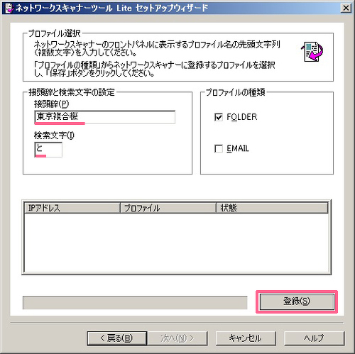 「検索文字(I)」は、複合機に複数の宛先が登録されている時に、検索で使用します。登録文字は任意ですが、大抵は「接頭辞(P)」で入力した頭文字を登録します。